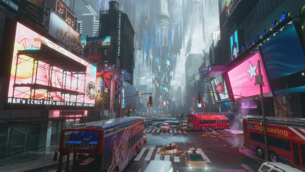 Il livello che ho avuto modo di esplorare è una sorta di ricostruzione di una grande città terrestre, ma vista dagli occhi dell’IA. C’è quindi tutto: i palazzi, le macchine, le pubblicità, ma le texture sono piene di glitch (volutamente, eh), il cielo non torna, e ovviamente ogni angolo è pattugliato da robot mutaforma che vogliono solo farci la pelle. È un’ambientazione magnifica, che spero soltanto ci restituisca – sul lungo periodo – un po’ di varietà in più sul fronte stilistico, magari con un sistema di “biomi” un po’ larghi che non si basino esclusivamente su elementi urbani.